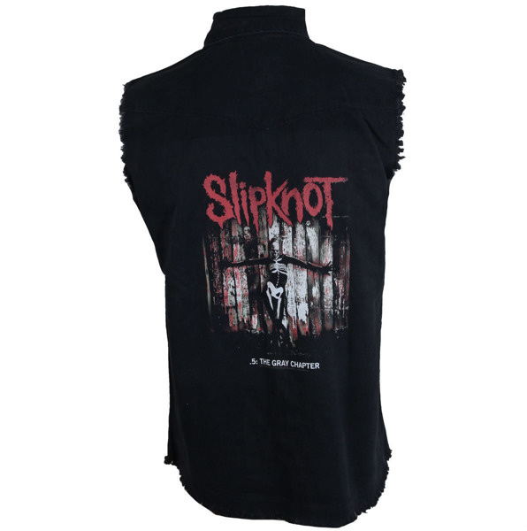 Cechy kamizelki: - kolor CZARNY, - wykonana jest ze 100% wysokogatunkowej bawełny. Bawełna jest gruba, mięsita, wysokiej jakości i odporna na niszczenie, w strukturze przypomina jeans, - kołnierz, - efektowne, postrzępione wykończenia na rękawach i u dołu, - zapinana jest z porzodu na czarne, metalowe zatrzaski, - z tyłu duży wysokogoatunkowy nadruk – tzw. „ekran”, - z przodu na lewej piersi, wyszywane logo SLIPKNOT, - z przodu na prawej piersi kieszeń zapinana na czarny, metalowy zatrzask. Wszystkie produkty, w tym nadruki, hafty i naszycia są dziełem RAZAMATAZ (tylko brytyjsko-europejskie rączki biorą udział w produkcji).| Rozmiar | Szerokość w klatce / cm | Długość / cm |