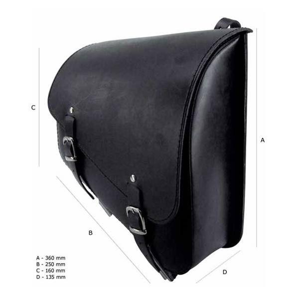 Smooth, black. Mounts to left side frame tube so bag will sit next to swingarm. Comes with mounting straps for easy installation. Approx. dimensions 36 to 21cm high x 14cm deep x 31cm long.