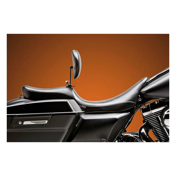Foam. Smooth upholstery. 12" rider seat width, 8" passenger seat width. One of the lowest profile seats, offers great lower back support with the built-in rider backrest.
