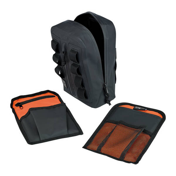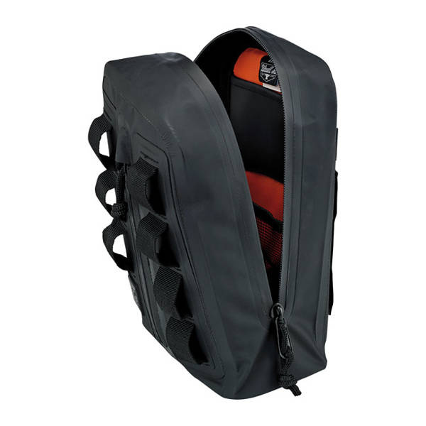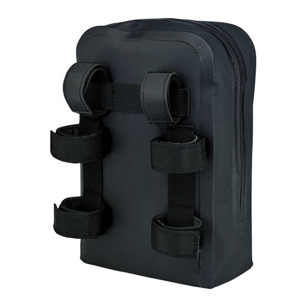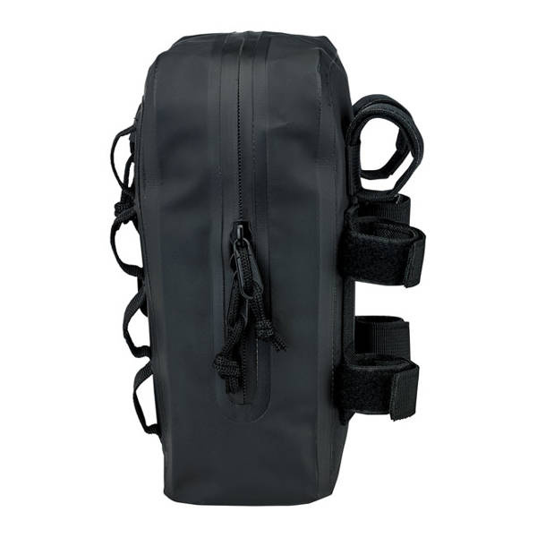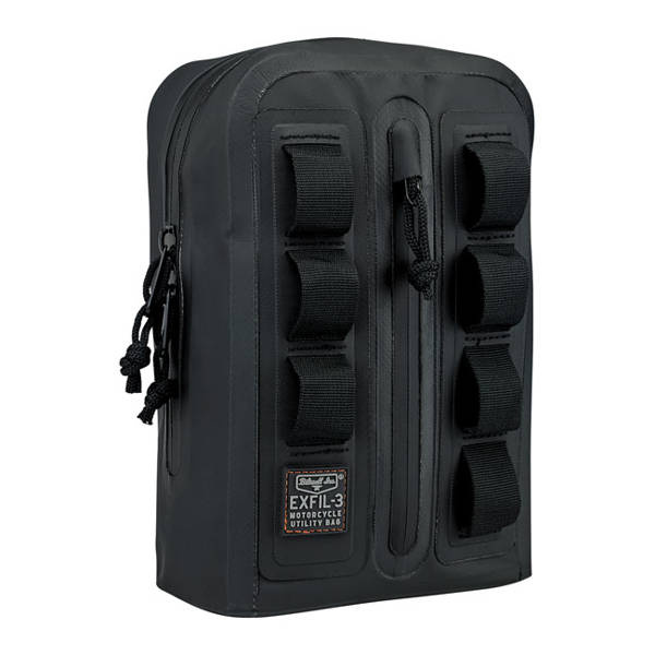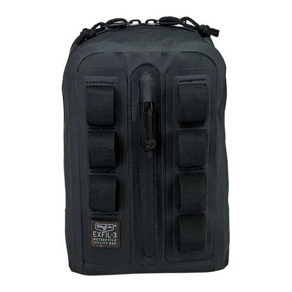 On the road you need space. Not too much, just enough to carry the necessities, and that is what the Exfil-3 bar bag is made for. Next you need to store the bag on the bike. What other place than against the risers? Perfect for compatibility with Club Style bikes with high rise risers or others with high bars. Apart from storage space you will benefit from serious wind-breaking features when hitting warp 3. In front is a vertical pocket and 7 Molle loops to attach stuff. Two organizing panels are found inside for smaller items, panels are removable to store larger things. Made from sturdy UV-treated 500 Tarpaulin PVC. Dimensions approx.: 6.75" (17.1cm) wide x 10" (25.4cm) high x 3.5" (8.9cm) deep.