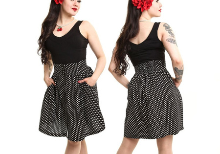 • Słodka bawełniana, czarna spódniczka z zaszewkami w białe kropeczki. Szeroki pas, zapinana z przodu na guziczki na całej długości. Dwie kieszenie po bokach. Z tyłu w pas wszyta marszczona gumka na części pleców. Materiał jest cienki, śliski. Prać w ręku.