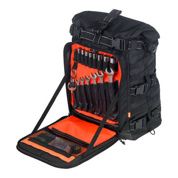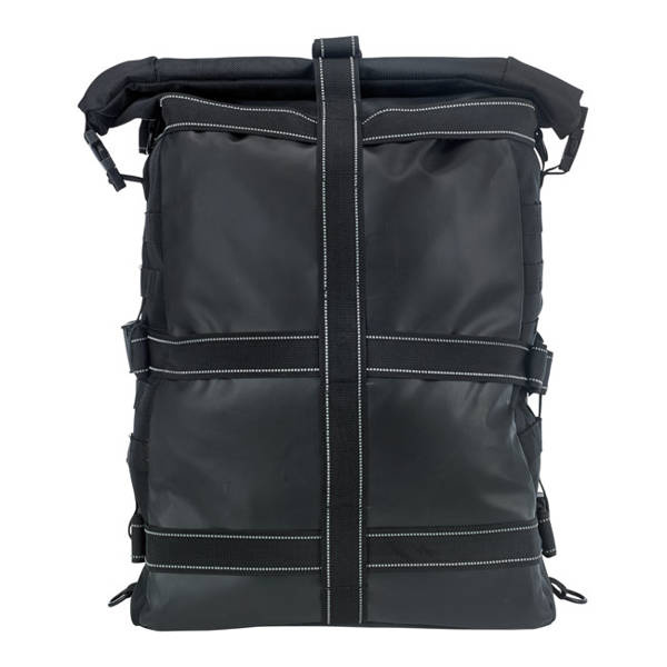 Black. Robust and large biker ruck sack. Specifically designed to hold what you need while traveling and camping. UV treated 1680 ballistic nylon, water resistant, use the built-in waterproof sleeve for 100% waterproofing. Main compartment size will hold up to 80 12 oz (355cc) US sized beer cans. On the outside an extra large tool compartment is found that can hold 9 deep sockets, 7 combination wrenches and includes a mesh pocket and flat document pocket and a shoulder strap. Overall dimensions full & closed: 14" (35.6cm) wide x 12" (30.5cm) deep x 20" (50.8cm) tall.