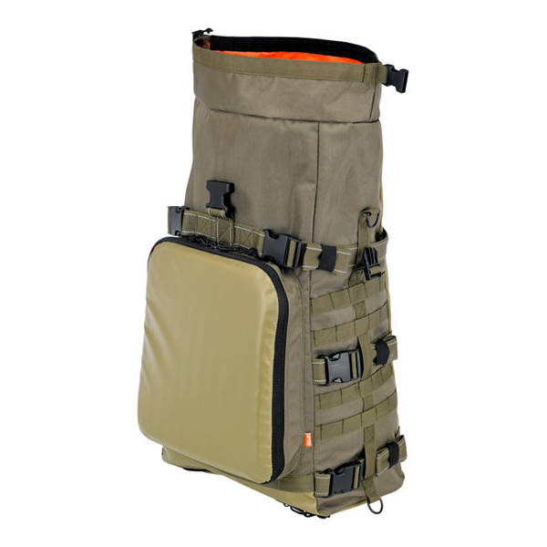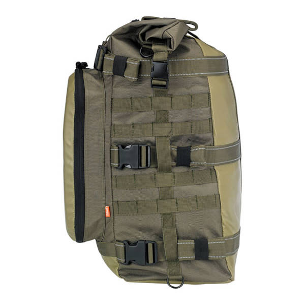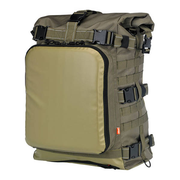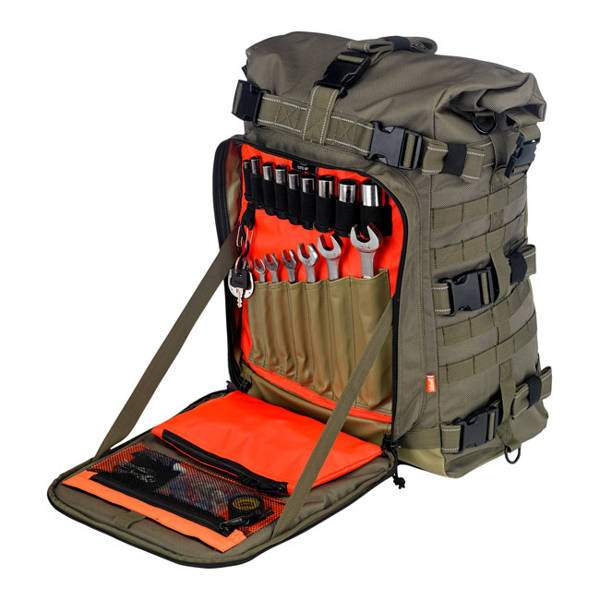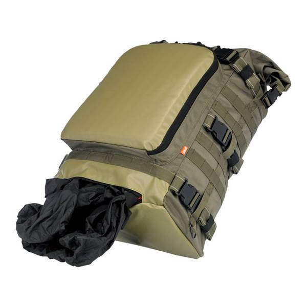 Green. Robust and large biker ruck sack. Specifically designed to hold what you need while traveling and camping. UV treated 1680 ballistic nylon, water resistant, use the built-in waterproof sleeve for 100% waterproofing. Main compartment size will hold up to 80 12 oz (355cc) US sized beer cans. On the outside an extra large tool compartment is found that can hold 9 deep sockets, 7 combination wrenches and includes a mesh pocket and flat document pocket and a shoulder strap. Overall dimensions full & closed: 14" (35.6cm) wide x 12" (30.5cm) deep x 20" (50.8cm) tall.