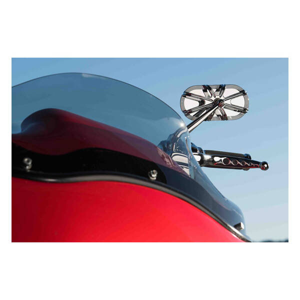 Another great example of why Arlen Ness still hovers above the rest, after half a century of customizing. Forged aluminum multi-parts open 3-D design mirror with stainless pivot hardware. Dimensions 5.45" wide x 2.5" tall.
