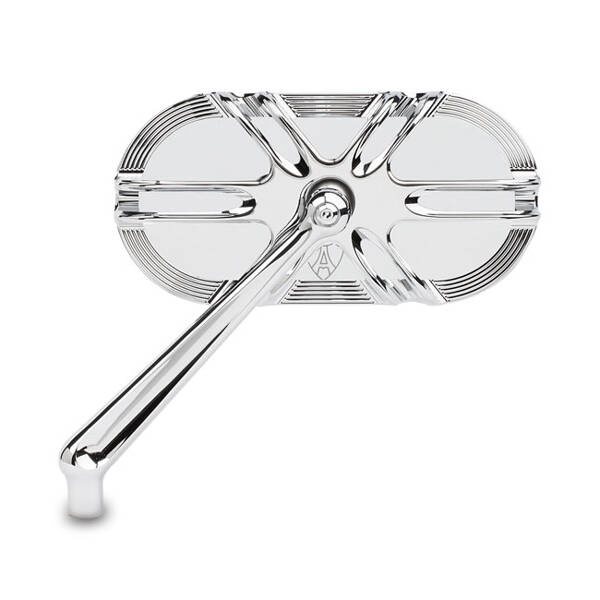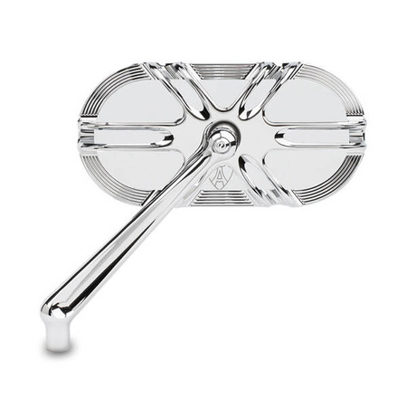 Another great example of why Arlen Ness still hovers above the rest, after half a century of customizing. Forged aluminum multi-parts open 3-D design mirror with stainless pivot hardware. Dimensions 5.45" wide x 2.5" tall.
