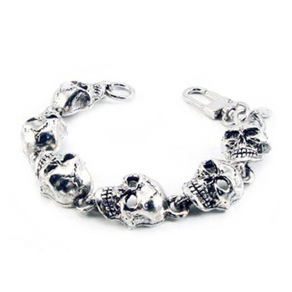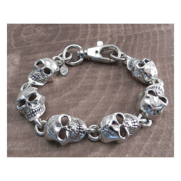 • Rockowa bransoleta marki - AMIGAZ z gwarancją najwyższej światowej jakości wykonania i użytych materiałów. Made in USA. Srebrna. Materiał pewter z antycznym srebrem. Długość 22cm. Ogniwa w kształcie 6 dużych czaszek. Solidne zapięcie typu "Bullnose".