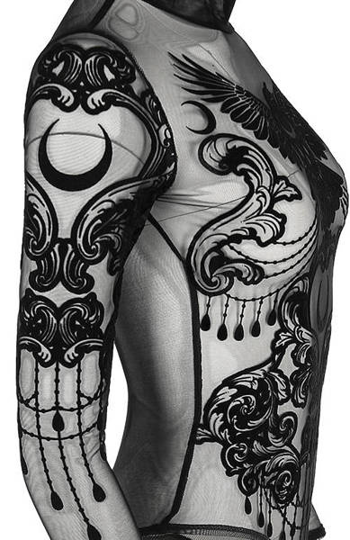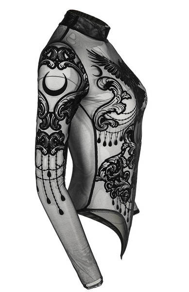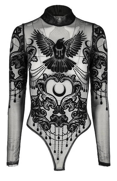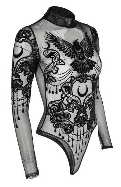 Gotyckie, czarne body z siateczki z motywem barokowego kruka