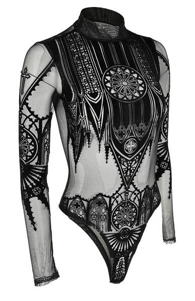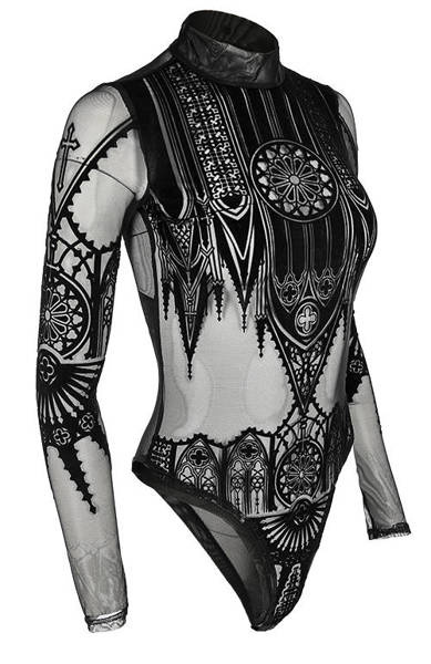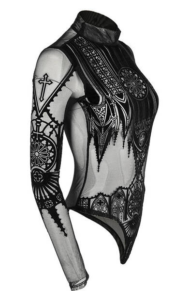 Gotyckie body z długim rękawem wykonane z czarnej, przezroczystej siateczki. Materiał dopasowuje się do ciała i zachowuje jak druga skóra.