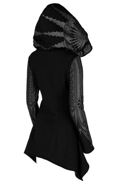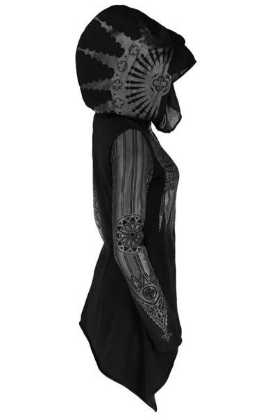 Inverted Cathedral Hoodie Regular Sleeves to idealny wybór dla miłośników mistycyzmu, tajemniczości i magii. Może być noszona z legginsami jako sukienka lub w casualowych stylizacjach, ale też świetnie sprawdzi się w bardziej gotyckich, drapieżnych zestawieniach.