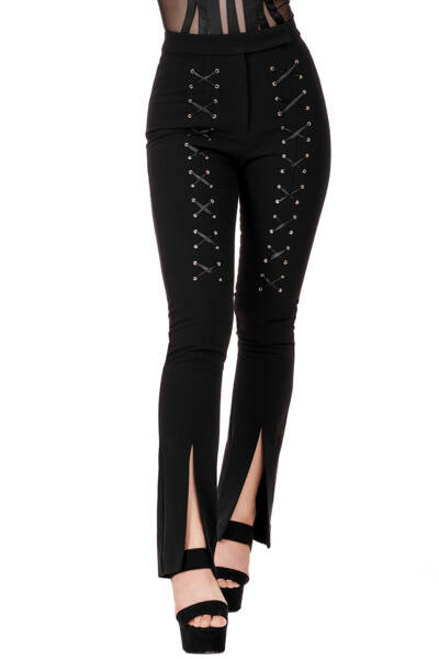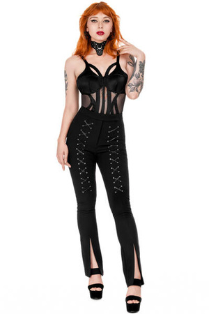 Gotyckie spodnie slim fit wspaniale wysmuklają sylwetkę i wydłużają optycznie nogi. Spodnie na każdej nogawce mają ozdobne gorsetowe sznurowania, które nadają im unikalny gotycki charakter.