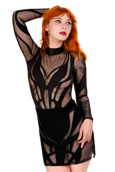 Gotycka spódnica Mini Phoenix to niezwykły i oryginalny element garderoby, który wzbudzi zachwyt swoim awangardowym stylem. Ta spódnica marki Restyle wykonana jest z aksamitu i siateczki, tworząc harmonijną kombinację tekstur.