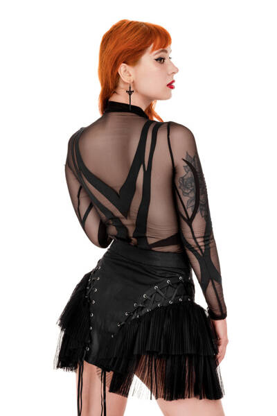 Spódnica wykonana z woskowanego czarnego jeansu, cechująca się intrygującą, delikatnie mieniącą się fakturą, zestawioną z bocznymi panelami z plisowanej siateczki. Te boczne panele akcentują biodra, sprawiając, że talia wydaje się jeszcze węższa.