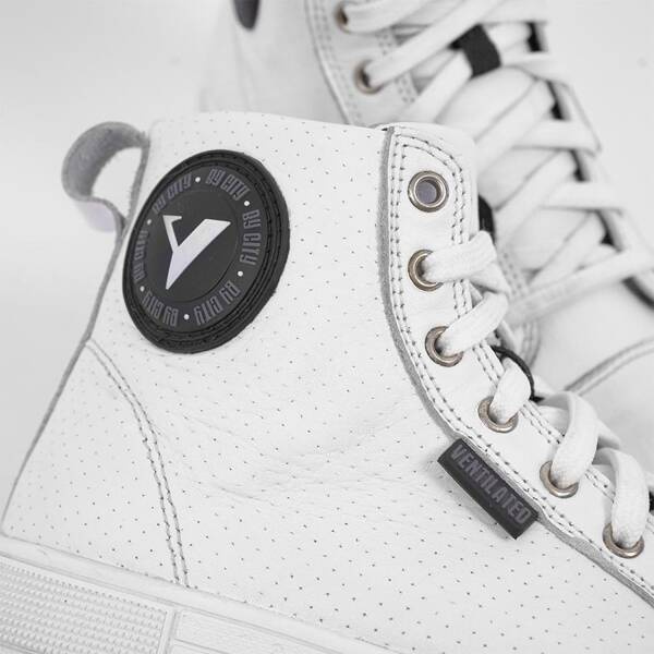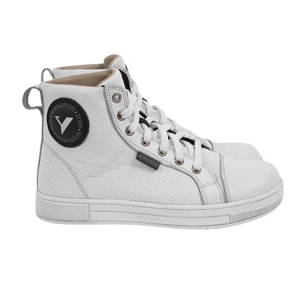 Buty motocyklowe wykonane z perforowanej skóry, posiadają ochronę palców, kostek i pięty, a także elementy odblaskowe dla dodatkowej widoczności.