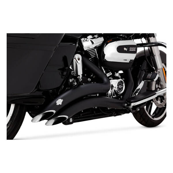 Matte black ceramic coated finish. Delivering the best of both worlds, radical custom-bike styling with high quality details, Big Radius reset the bar for aftermarket exhaust systems. Comes with full coverage 2-1/2" diameter plasma cut heat shields that preserve the 'new' look and will virtually eliminate visible blueing. Now featuring our innovative PCX™ Technology, which integrates chambered high-flow catalysts for a boost in torque while producing the deep throaty growl you want from your V-Twin machine. - PCX™ (Power Chamber Exhaust) technology - Chambered high-flow catalyst cartridge cesigned to increase torque - Full coverage heat shields. Vance & Hines innovative PCX™ Technology: More Power & Less Heat. The PCX™ (Power Chamber Exhaust) Technology are factually chambered high-flow catalysts. Used to increase mid-range torque for more responsive acceleration off the line. They are positioned downstream for up to 20% less heat at the floorboards / footpegs and 50% less heat at the collector, to optimize rider comfort over the stock system. Tech-Tip: Pre-2021 USA mufflers on a 2021-up Softail/Touring? The FuelPak FP4 (part number 942227) allows you to disable the 2nd. O2 sensor in the muffler, or in the balance pipe of the cross-over section, without triggering trouble codes. This will enable you to use exhaust mufflers for earlier/US models that are not equipped with an O2 sensor connection.