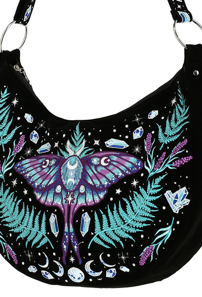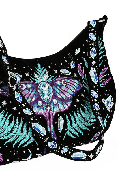 Przed Tobą unikalna torebka w stylu hobo z pięknym haftem, którego centralne miejsce, niczym klejnot, zajmuje magiczna ćma. Jej skrzydła błyszczą w odcieniach fioletu, różu i błękitu. Wyszywane kryształy, fazy księżyca i gwiazdy rozsiane po powierzchni torby zdają się delikatnie migotać, jakby opowiadały tajemnicze historie nocy. Nie mogło też zabraknąć naszego znaku rozpoznawczego, czyli liści paproci!