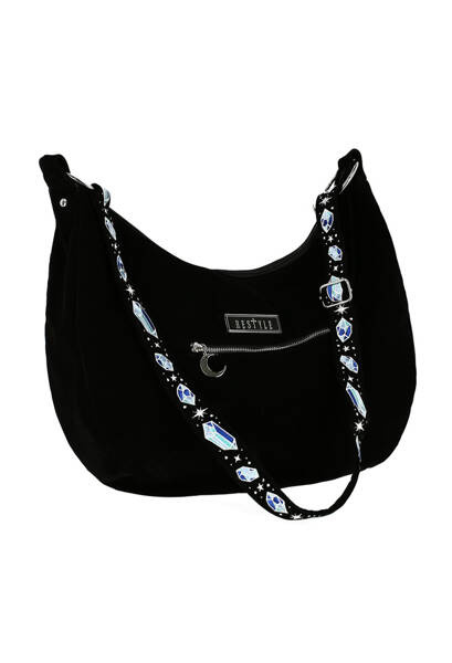 Gotycka torba-worek jest niezwykle pojemna - na tyle, by pomieścić wszystkie tajemnice zaczarowanego lasu... W środku znajdziesz dwie przegródki, które ułatwiają organizację przedmiotów. Tylna kieszeń zapinana na zamek ze srebrnym półksiężycem pomieści wszystkie Twoje sekretne zaklęcia. Torba na ramię ma wygodny, regulowany pasek.