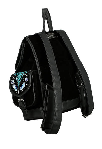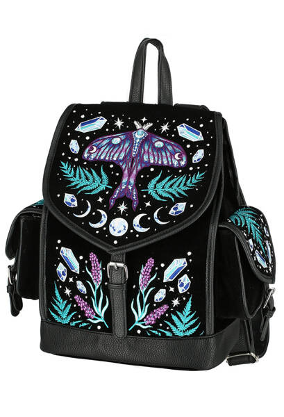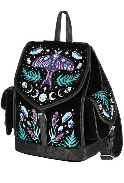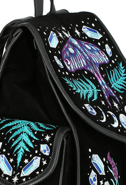 Plecak „Enchanted Forest” to magiczny artefakt, który w swoim wnętrzu skrywa historię nocnego lasu i tajemniczą siłę natury. Najbardziej fascynującym elementem misternego haftu jest ćma, która zdaje się unosić w powietrzu na czarnym tle. Okalają ją migoczące fazy księżyca, roziskrzone gwiazdy i mieniące się kryształy. Liście paproci i kwiaty lawendy przywodzą na myśl tajemniczy, zaczarowany las.