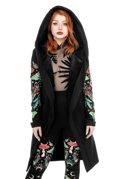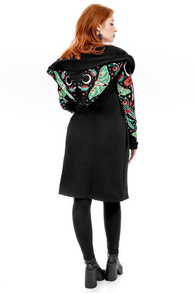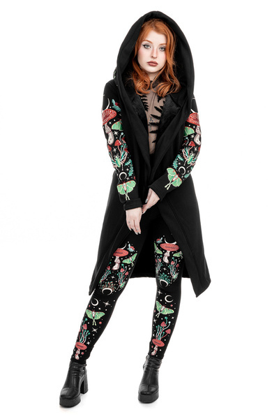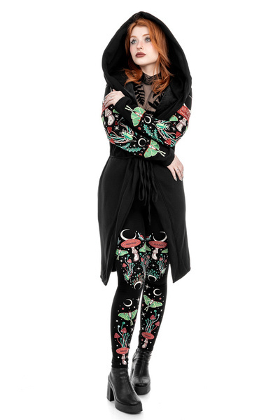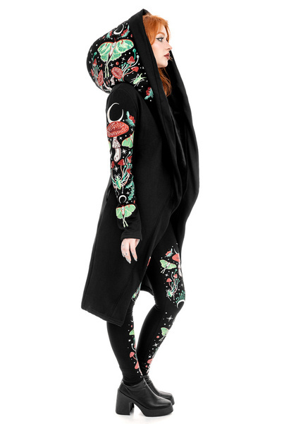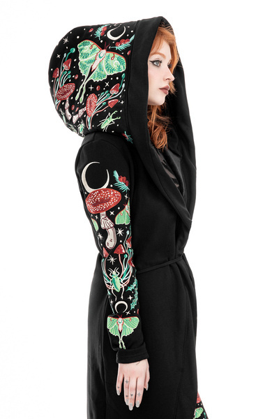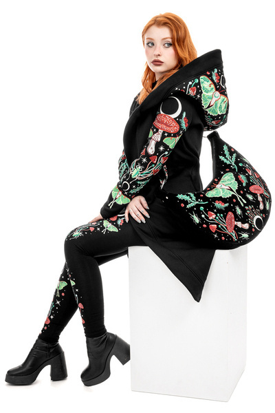 ⋆ Hipnotyzujący wzór na kapturze i rękawach, przedstawiający magiczne muchomory i grzybki psylocybinowe, nieziemskie ćmy księżycówki i chrząszcze, halucynogenny cis i oset, okraszone gwiazdkami i półksiężycami
