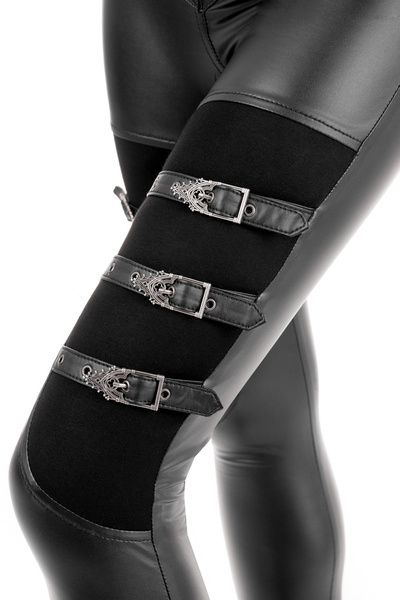 ⋆ Czarne, zadziorne wstawki na udach z paskami ze skóry wegańskiej i klamrami w kształcie katedr