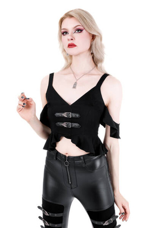 Gotycka bluzka z baskinką łączy klasykę z nutą zadziorności! Czarny top zdobią wyraziste paski z ekoskóry i nasze charakterystyczne srebrne klamry w kształcie katedr.