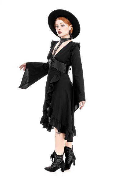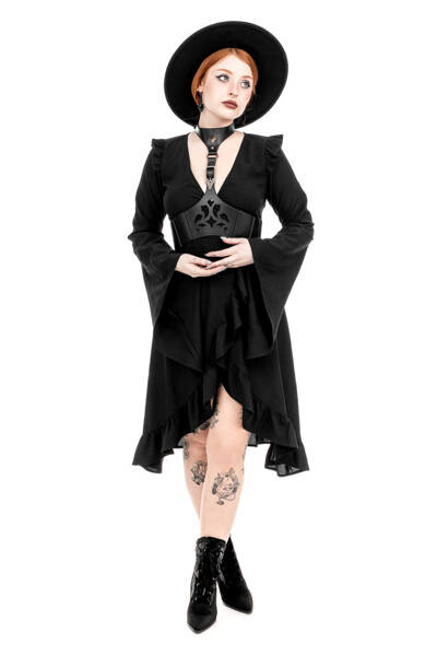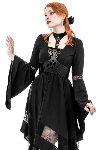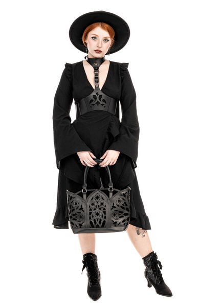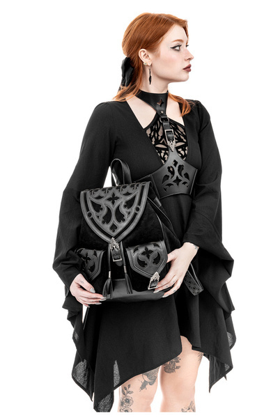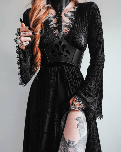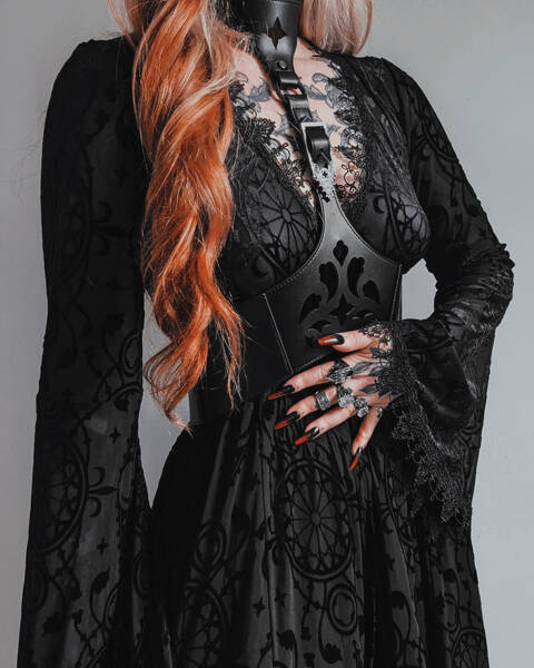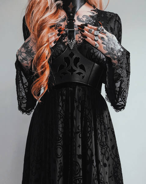 - Misterne wzory inspirowane gotycką architekturą, wycinane laserowo pod biustem i na chokerze