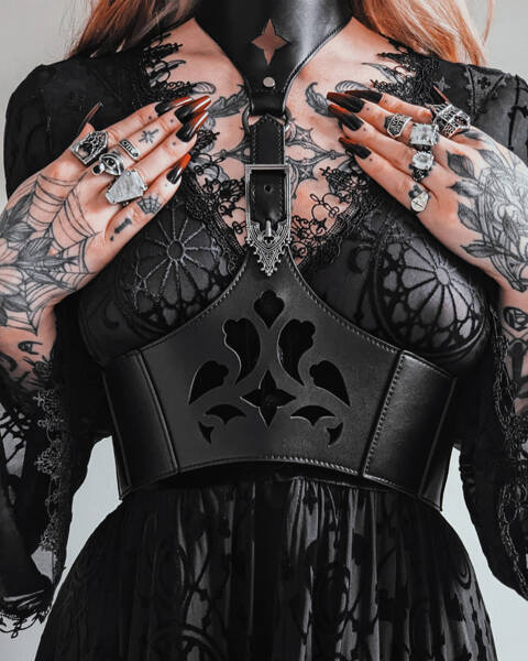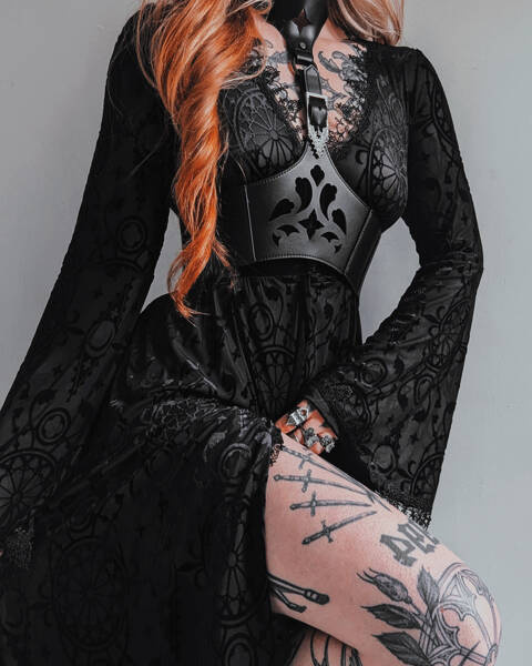 Minimalistyczny, ale maksymalnie gotycki. Masz odwagę, by założyć nasz harness DEADLY SINS? Wyjątkowy pasek z chokerem to idealny wybór dla kobiet, które łączą elegancję z odrobiną drapieżności. Smukłe linie podkreślają talię i uwydatniają biust, a kultowa już srebrna klamra w kształcie iglicy dodaje wyrazistości.