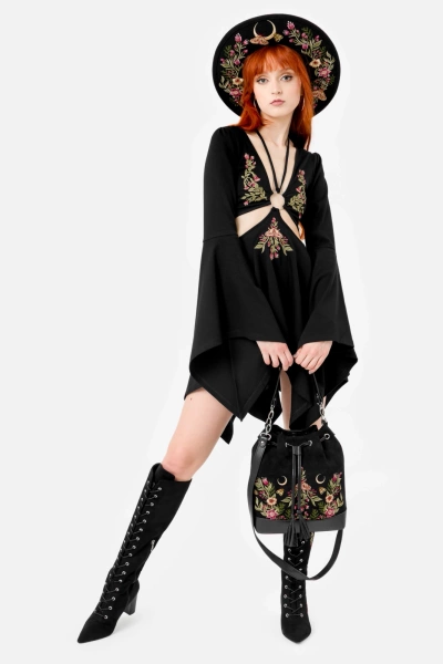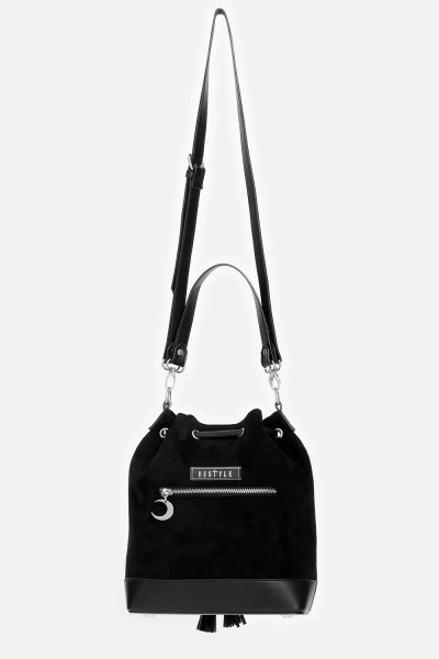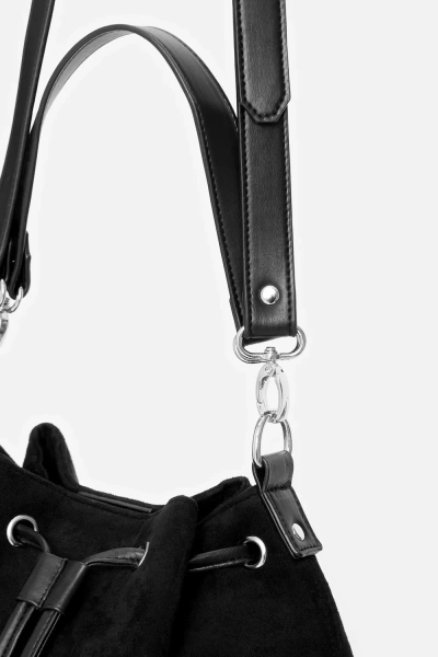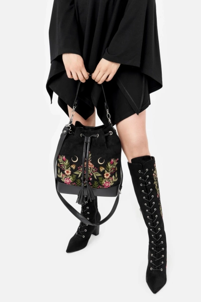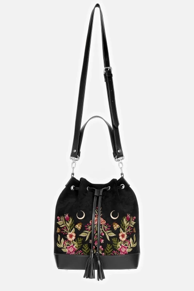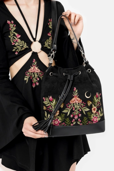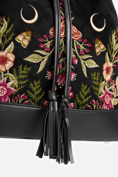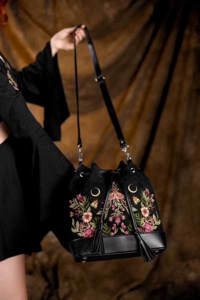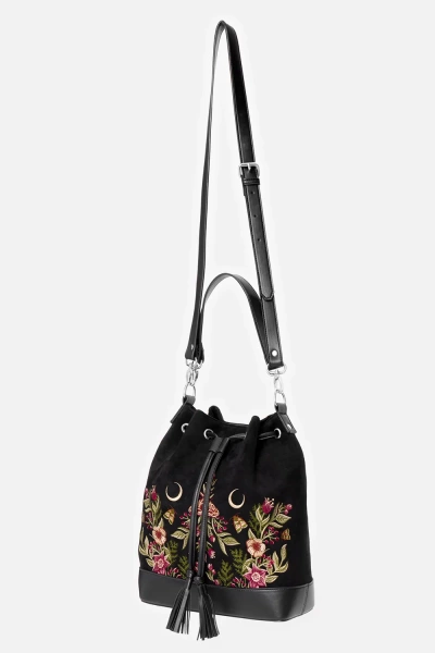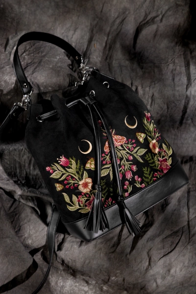• Czarna zamszowa torebka z botanicznym haftem kwiatów i ćmy, ściągana na sznurek z uroczymi frędzlami – łatwe i bezpieczne zamykanie, zasuwana kieszonka w środku oraz z tyłu–na drobiazgi, 2 paski: krótki do noszenia w dłoni, dłuższy do noszenia na ramieniu