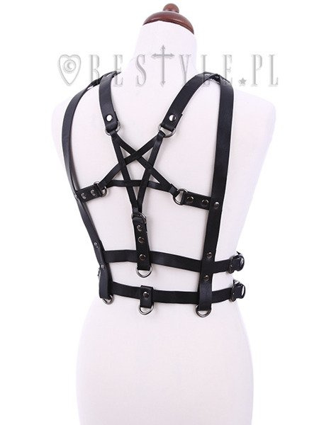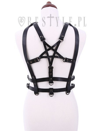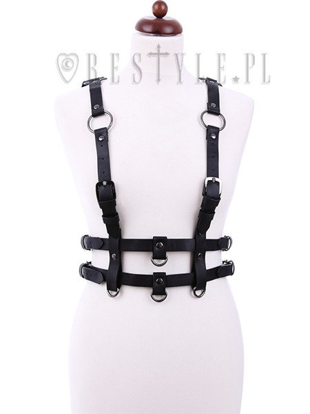 Pasek wykonany z czarnej eko-skóry. Składa się z szelek na ramiona połączonych z podwójnymi paskami w talii.