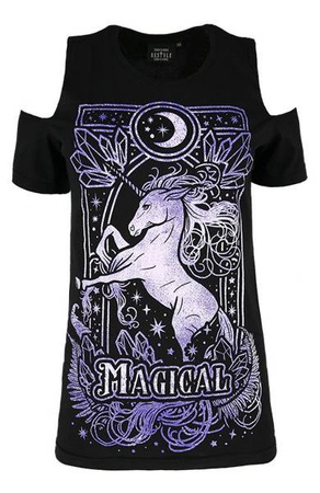Nadruk na koszulce przedstawia jednorożca otoczonego ramką z kryształów i migoczących gwiazd.