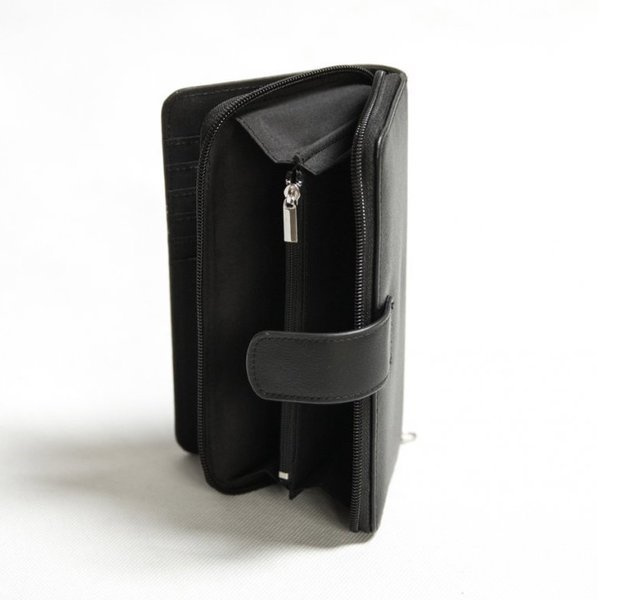 Wewnątrz liczne kieszenie, w tym jedna na monety zapinana na zamek, oraz miejsca na karty i zdjęcie.