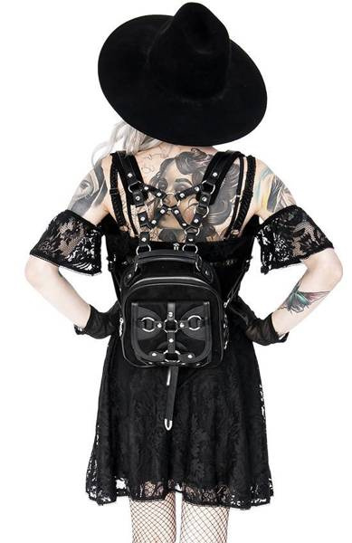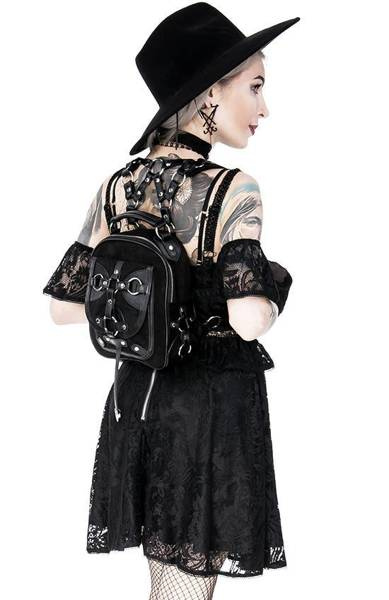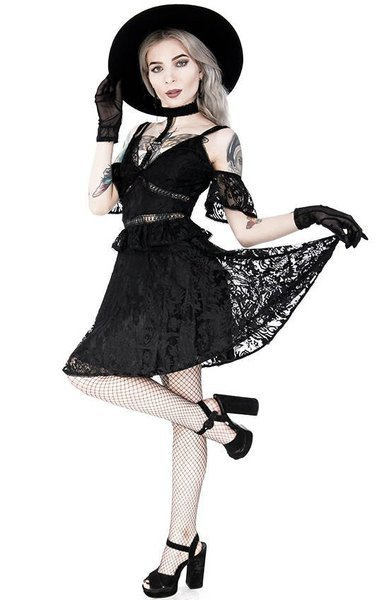 Gotycka sukienka z baskinką. Góra mocno dopasowana, na cienkich ramiączkach. Głęboki dekoltem w serek, zrobi koronkowa taśma z pentagramem biegnącą wokół szyi tworząc choker. Obroża ma regulowane zapięcie, dzięki czemu dopasujesz ją do obwodu szyi. Rękawki są krótkie, typu cold shoulder, zakończone falbanką. Góra sukienki odcinana pod biustem oraz w talii przezroczystym pasem z koronki. W talii wszyta niewielka baskinka delikatnie opadająca na biodra. Dół sukienki rozkloszowany, sięgający przed kolano.