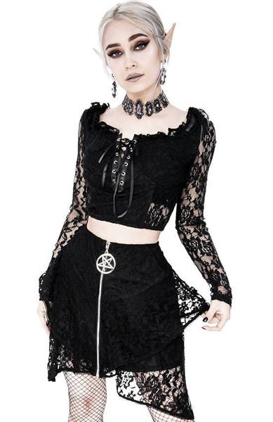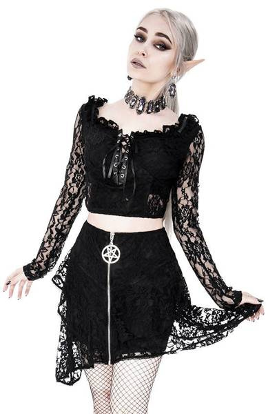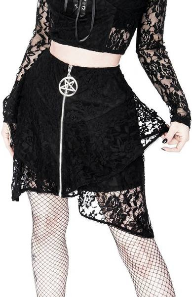 Gotycka mini spódnica wykonana z miękkiej koronki. Dodatkowo ozdobiona warstwami materiału, który podkreśla biodra. Wewnątrz czarna, nieprześwitująca podszewka. Spódnica nie gniecie się, dlatego nie trzeba jej prasować. Zapinana na metrowy zamek błyskawiczny zakończony uchwytem w kształcie pentagramu.