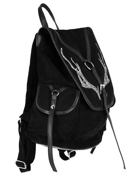 Gotycki plecak wykonany ze sztucznego, miękkiego w dotyku zamszu. Wykończony lamówkami ze sztucznej skóry. Główna kieszeń ściągana troczkiem, dzięki czemu nic nie zgubisz. Klapę zdobi nadruk poroża jelenia i skórzane paseczki z metalowym elementem. Po bokach znajdziesz kieszonki, do których zmieścisz telefon, klucze i inne drobiazgi. Obie są na magnetyczne zapięcie. Z tyłu, tuż przy Twoich plecach, znajduje się jeszcze jedna kieszonka, zapinana na suwak. Włóż do niej portfel lub wartościowe rzecz. Będziesz mieć pewność, że są bezpieczne. Plecak wewnątrz ma dwie komory, w tym jedną otwartą.