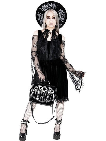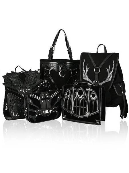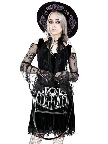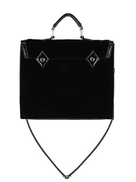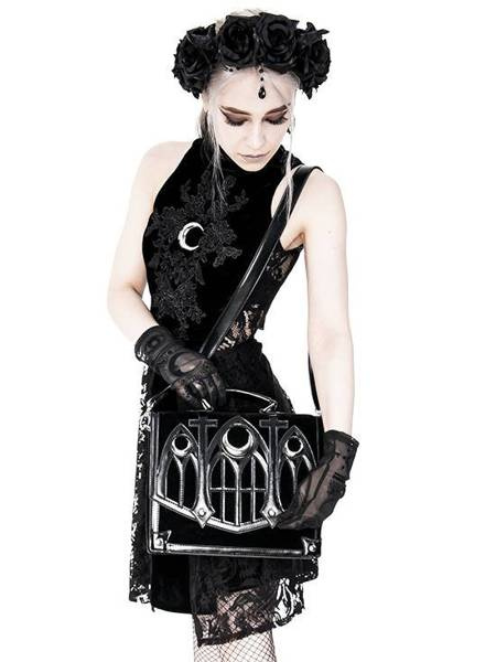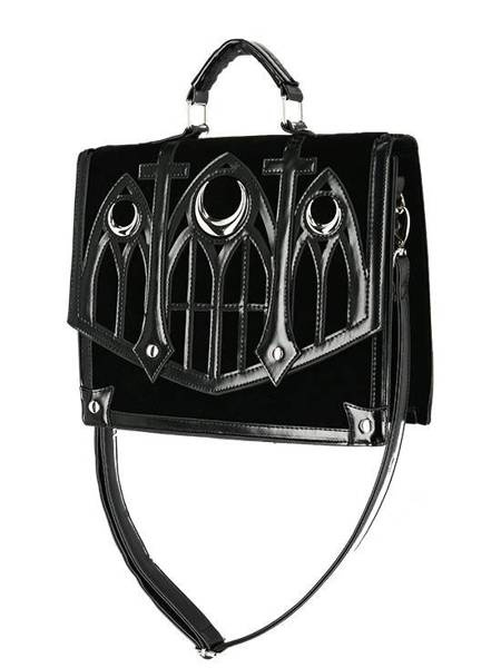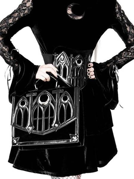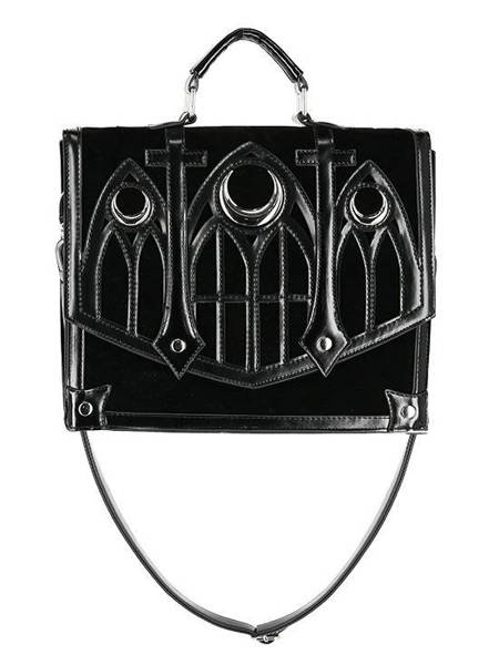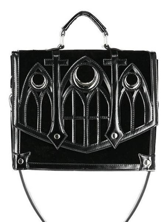Gotycka teczka wykonana z aksamitu i obszyta sztuczną skórą. Klapę zdobi wycinany laserowo wzór katedralny, inspirowany architekturą gotycką. Okna rozety we wzorze, podkreślają trzy metalowe półksiężyce. Torebkę zamkniesz na magnetyczny zatrzask.