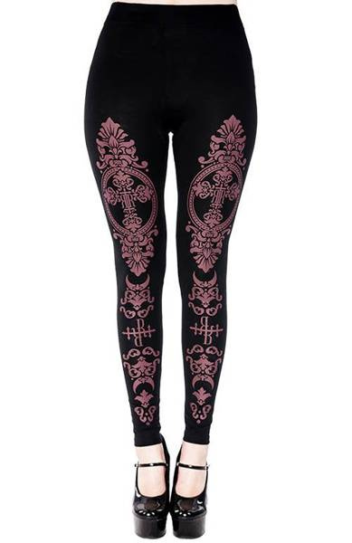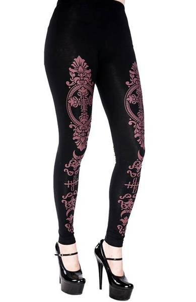 Czarne, gotyckie legginsy z bordowym monogramem Restyle