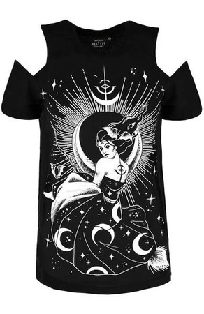 Nasza Nox na koszule typu cold shoulder to wersja gotycka, współczesna, ale nadal z magicznymi mocami. Swoje skrzydła zamieniłam na szybką miotłę, żeby sprostać oczekiwaniom dzisiejszego świata. Ubrała suknię w półksiężyce i nałożyła wieczorowy makijaż, jak na boginię przystało.