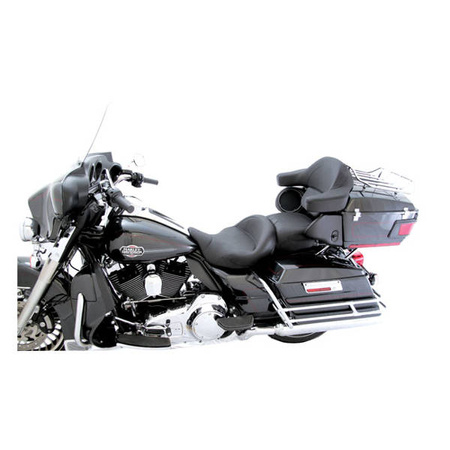 Black. Front width 19", rear width 14". Standard stitch. One-piece 2-up seat with an extremely comfortable and wide rider's bucket, with an 1.75" further backwards seating position (compared to a stock Electra Glide position), and a likewise generous passenger seating area. This one is the ultimate Mustang for some serious PowerTouring and could very well be your choice when entering the Iron Butt. Seats will fit with a handrail. Note 1: Not compatibe with H-D or regular Mustang backrest kits. They can, however, be equipped with the separetely available Mustang backrest 537512 (Smooth) or 537513 (Regal) backrest pad & post, which will fit the built-in receiver.