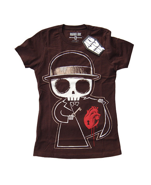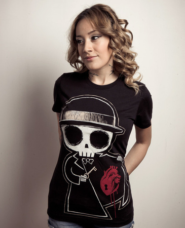 Koszulka rockowa Akumu Ink z dekoltem typu scoop neck z ręcznie malowaną grafiką z przodu. Nasz przystojniak szkielet, zamknął swoje serce raz i na zawsze. Koniec miłości....majtki na ......