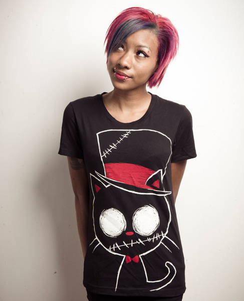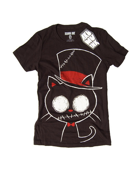 Koszulka rockowa Akumu Ink z ręcznie malowaną grafiką z przodu. A tu kot zombie z zaszytą mordką - czyżby kogoś wykurzył jego tajemniczy uśmiech pojawiający się bez uprzedzenia??