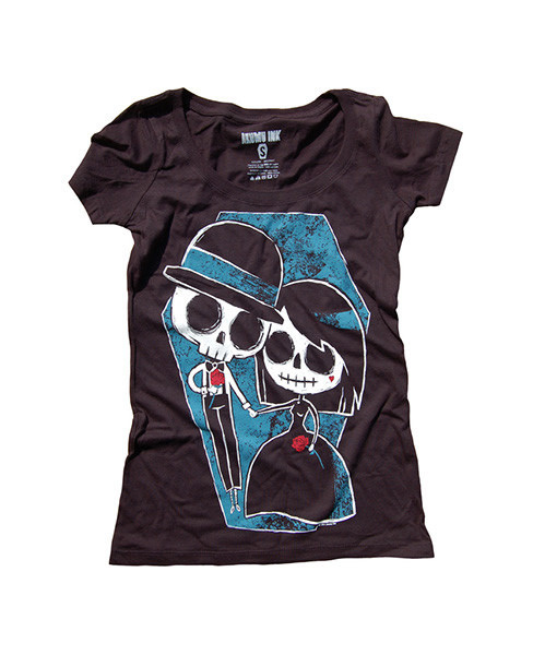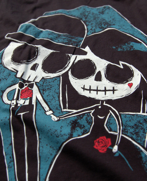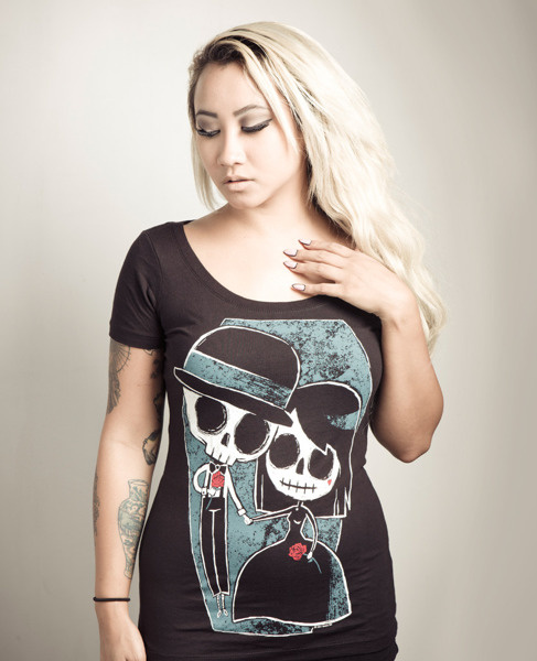 Koszulka rockowa Akumu Ink z dekoltem typu scoop neck z ręcznie malowaną grafiką z przodu. Para połączona przez Śmierć już na wieczność zostanie razem.