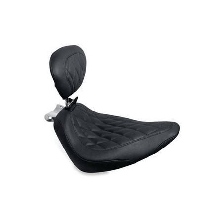 Black. 14" wide. Diamond style stitch. With adjustable rider backrest. The backrest is easily removed when not required. Note 1: Mustang solo seats & passenger seats cannot be mixed with OEM solo or passenger seats. Note 2: Solo seat will work with the regular 537472 Mustang style matching passenger seat, without requiring a backrest recess.