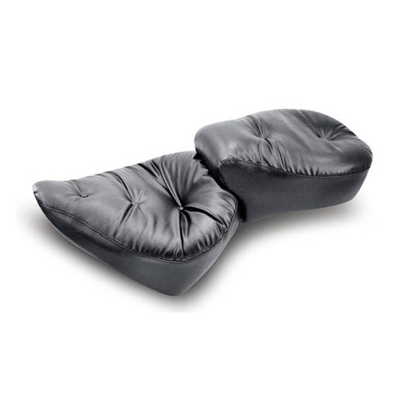 Black. Front width 17.5", rear width 14". A classic pillow seat, hand-tied buttons and extra padding for the true upholstered pillow top look. Comes with a low cut riders area to give great lower back support. The squared off passenger seat area enables the largest seating surface for the given width. The seat is built with a one-piece marine-grade fiberglass baseplate. Note: The stock rear mounting bracket must be removed from the stock seat and bolted to the Mustang seat. If the stock bracket is missing, use Mustang bracket #78037/MCS537407 or H-D® #52467-00.