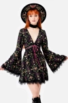 Mini dress with lace details and botanical print. True-to-size fit with an elasticated back waistband for comfort. Mini length with a floaty, flared skirt – playful yet elegant. Exclusive Wilderwood print. Witchy, ethereal flared sleeves