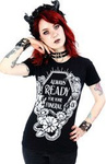 Black gothic classic t-shirt. Made in Poland from 100% cotton. Well-fitted classic design. There is bold inscription "always ready for your funeral" in a coffin shape with flowers around it. You may consider it twice wearing it to your grandma`s house.