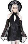 Gotycka, zwiewna, warstwowa tunika sukienka w stylu fantasy. Zapinana na szyi, odkrywa i eksponuje plecy oraz ramiona. Obróżkę można regulować. Fason podkreślający talię, lekko rozszerzany. Długie, rozszerzane rękawy z szyfonu. 95% bawełna, 5% spandex
