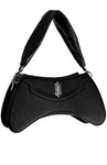 Czarna, gotycka torebka w kosmicznym kształcie. Uszyta ze sztucznej skóry z teksturą grain swoim wyglądem przypominająca ziarenka piasku. W zestawie szeroki pasek do przewieszenia przez ramię oraz dodatkowy, długi do noszenia à la cross body.