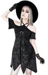 Gotycka sukienka z baskinką. Góra mocno dopasowana, na cienkich ramiączkach. Góra odcinana pod biustem. Głęboki dekolt w serek. Obroża ma regulowane zapięcie. Rękawki typu cold shoulder, zakończone falbanką. W talii niewielka baskinka 100% poliester.