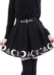 Spódnica wykonana z bardzo grubej i sztywnej bawełny. W talii wszyty szeroki pas, który dla lepszego dopasowania posiada marszczoną gumkę z tyłu. Posiada szerokie plisy. Dół zdobiony unikalnym nadrukiem. Zapinana z boku na kryty suwak i 2 guziczki.