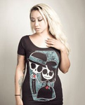 AKUMU - z japońskiego NIGHTMARE i w takim klimacie są rockowe koszulki tej amerykańskiej marki. Słodka Catrina z czaszką na kolanach. Ręcznie malowane w Kalifornii.