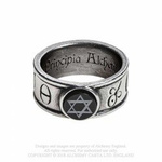 Obrączka z cyny pewter z wygrawerowanymi dookoła ważnymi symbolami alchemicznymi i wyróżnionym na środku 8. mm dyskiem z czarnego onyksu. Pieczęć tajemna Salomona.